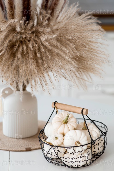 Концепция уютного дома осенью. натюрморт. букет высушенной травы панпаса в вазе и белые тыквы на белом столе в домашней кухне в скандинавском стиле