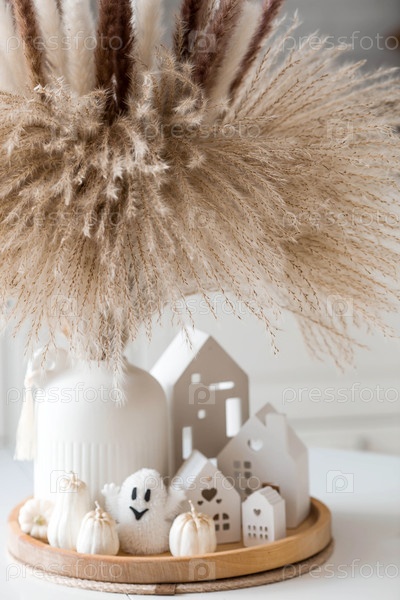Осенняя концепция домашнего комфорта. Празднование Хэллоуина. Букет высушенной травы панпаса, белых тыквен, керамических домов и призрак на белом столе в кухонном интерьере