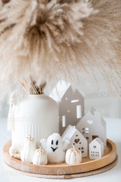Осенняя концепция домашнего комфорта. Празднование Хэллоуина. Букет высушенной травы панпаса, белых тыквен, керамических домов и призрак на белом столе в кухонном интерьере