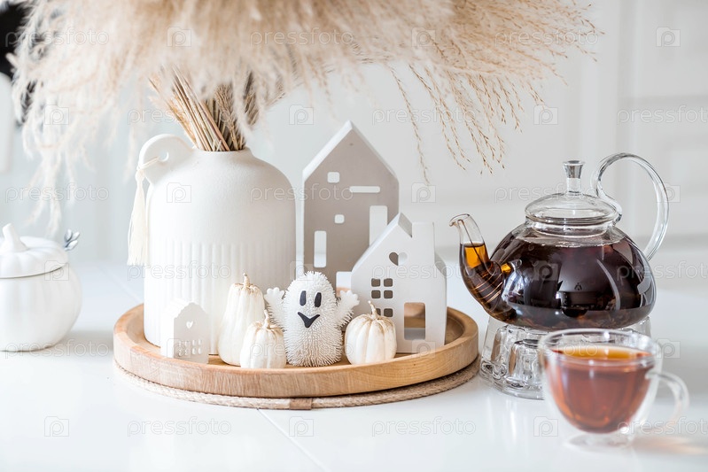 Уютная домашняя осенняя композиция. букет сухой травы панпаса в вазе, белые тыквы, призрак, чайник и чашка на белом столе в домашней кухне скандинавского стиля