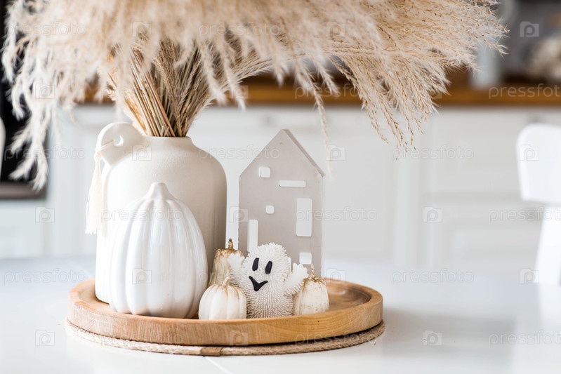 Осенняя концепция домашнего комфорта. Празднование Хэллоуина. Букет высушенной травы панпаса, белых тыквен, керамических домов и призрак на белом столе в кухонном интерьере