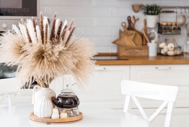 Концепция уютного дома осенью. натюрморт. букет сушеных трав пампасы в вазе, белые тыквы и чайник на белом столе в домашней кухне в скандинавском стиле