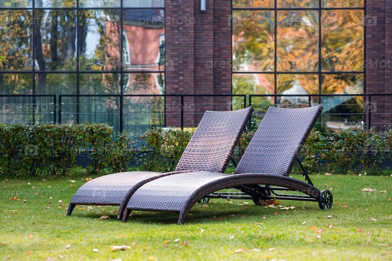 Два шезлонга на зеленой лужайке во дворе отеля. концепция отдыха, расслабления и омоложения