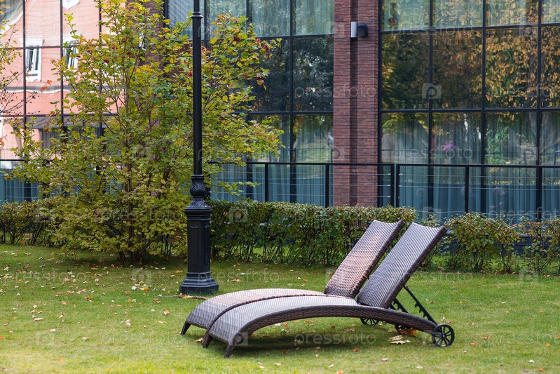 Два шезлонга на зеленой лужайке во дворе отеля. концепция отдыха, расслабления и омоложения