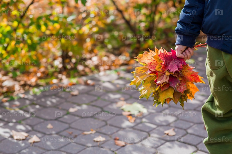 Красивый, яркий и красочный букет осенних кленовых листьев в руке маленького мальчика