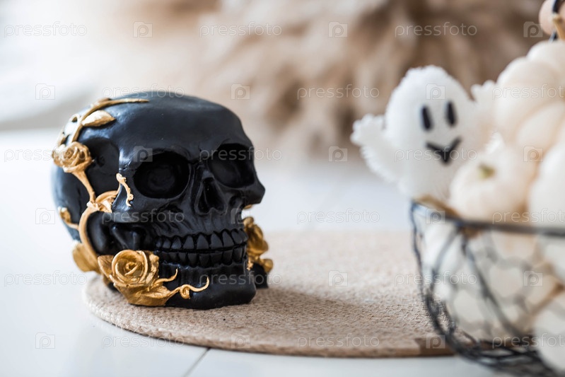 Чёрный череп, призрак и тыквы на столе. Баннер, фон для Хэллоуина или Дня мертвых