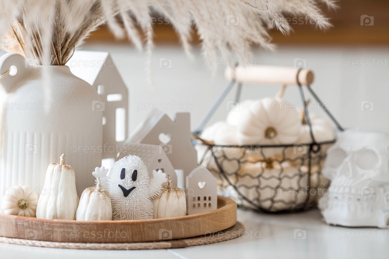 Осенняя концепция домашнего комфорта. Празднование Хэллоуина. Букет сухой травы, белых тыквен, керамических домов, черепа и призрака на белом столе в интерьере кухни