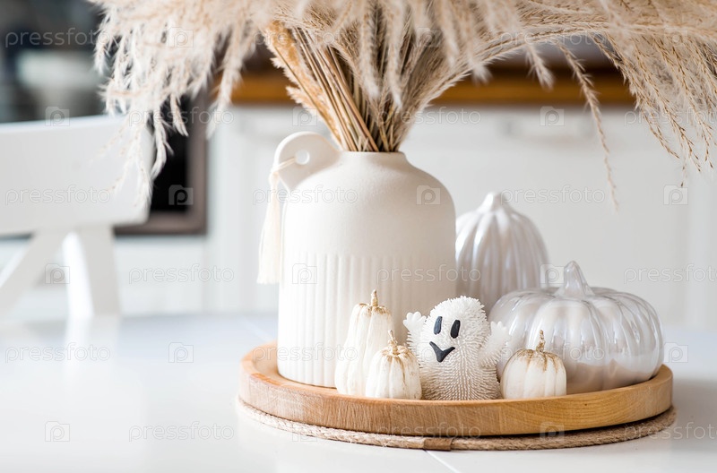 Осенняя концепция домашнего комфорта. Празднование Хэллоуина. Букет сухой травы, белых тыквен, черепа и призрака на белом столе в кухонном интерьере
