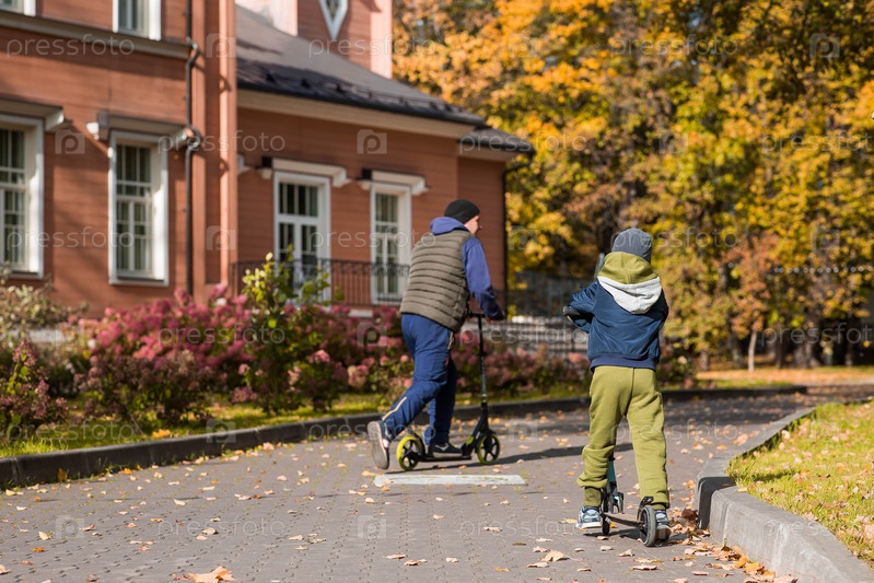 Маленький мальчик и его отец едут на скутере в красивом осеннем парке в солнечный день Отдых и семейный досуг Парк городской пейзаж