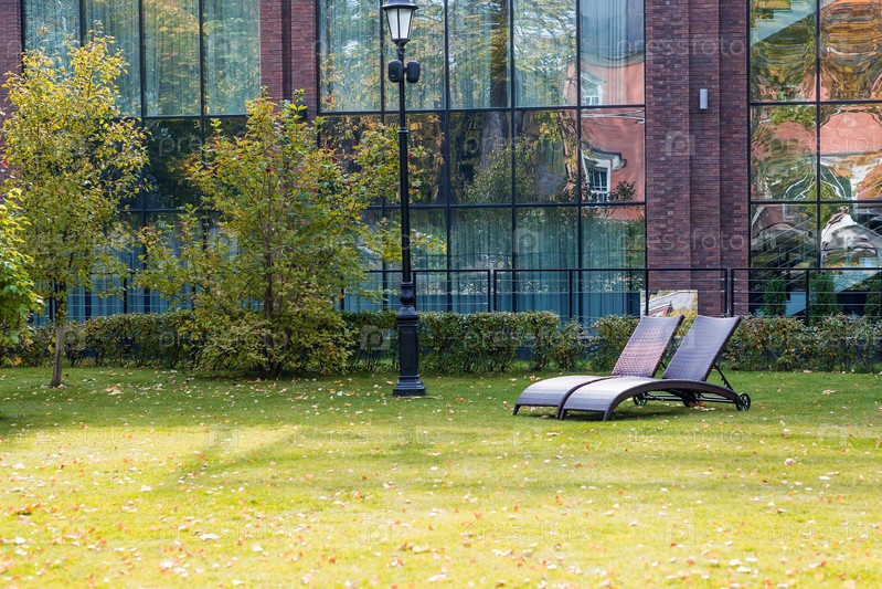Два шезлонга на зеленой лужайке во дворе отеля. концепция отдыха, расслабления и омоложения