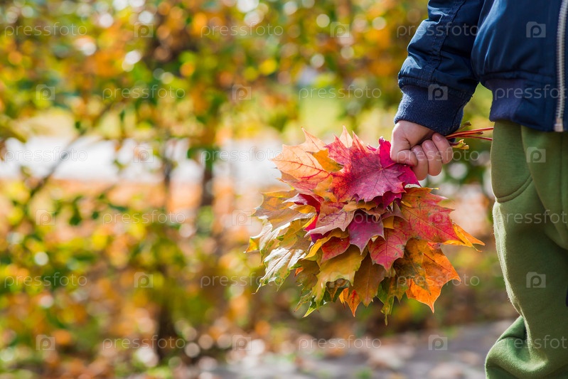 Красивый, яркий и красочный букет осенних кленовых листьев в руке маленького мальчика
