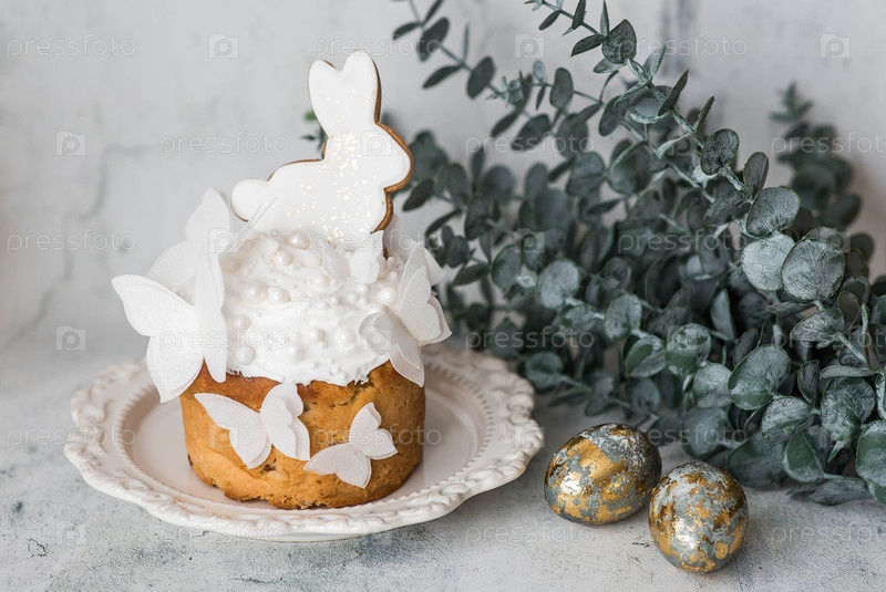 Стильный пасхальный натюрморт. Пасхальный торт с белым кроликом и бабочками, пасхальные яйца со золотыми ветвями эвкалипта на светлом мраморном фоне. Счастливого Пасхи 2026