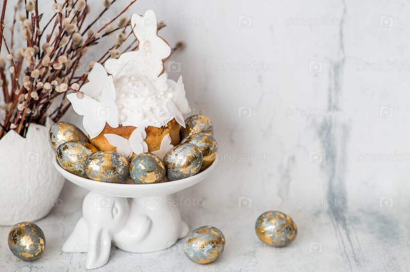 Стильный пасхальный натюрморт. Пасхальный торт с белым кроликом и бабочками, пасхальные яйца со золотыми ветвями ивы на светлом мраморном фоне. Счастливого Пасхи 2026