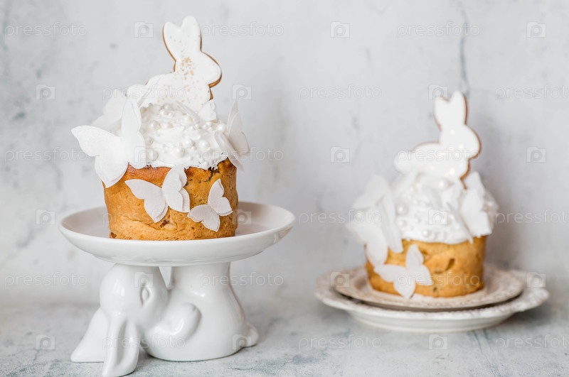 Стильный пасхальный натюрморт. Пасхальный торт с белым кроликом и воздушными рисовыми бабочками на светлом мраморном фоне. Счастливая Пасха 2026
