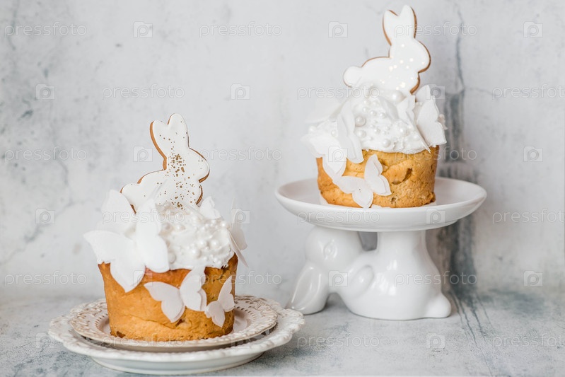 Стильный пасхальный натюрморт. Пасхальный торт с белым кроликом и воздушными рисовыми бабочками на светлом мраморном фоне. Счастливая Пасха 2026