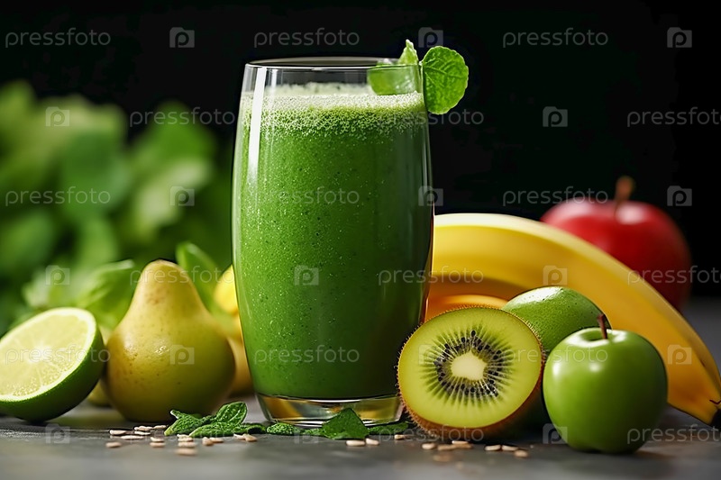 Зеленый коктейль в стеклянной чашке с листьями на вершине, с фруктами киви, грушей, яблоками, лаймами, бананами
