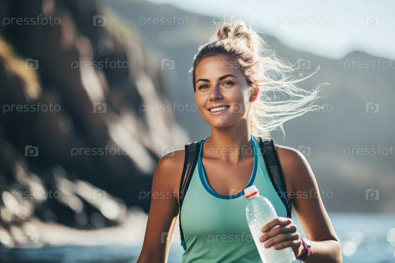 Красивая девушка с бутылкой минеральной воды во время занятий спортом, на фоне горного пейзажа в размытой форме
