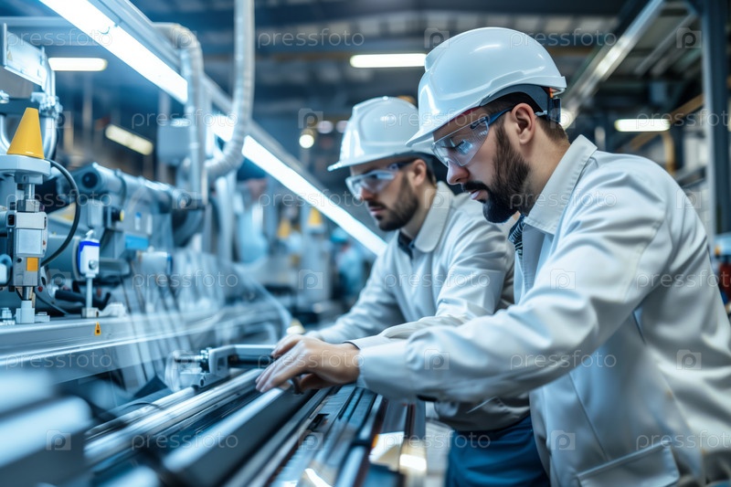 Работники в защитном снаряжении концентрируются на производственной линии фабрики, обеспечивая точность и контроль качества при производстве