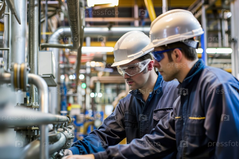 Два инженера в шапке безопасности работают вместе над оборудованием на оживленном промышленном объекте, обеспечивая точность и эффективность во время работы