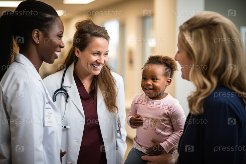 Группа медицинских работников, предоставляющих руководство и поддержку родителю с ребенком, подчеркивая ценные ресурсы и опыт, доступный для родителей в решении проблем со здоровьем
