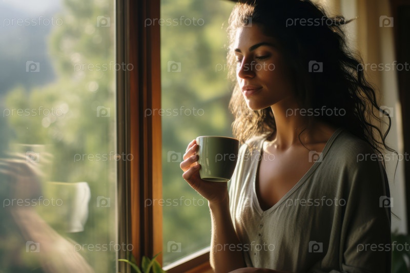 Красивая брюнетка наслаждается моментом с чашкой чая у окна, захваченной во время мягкого утреннего света, изображая спокойствие
