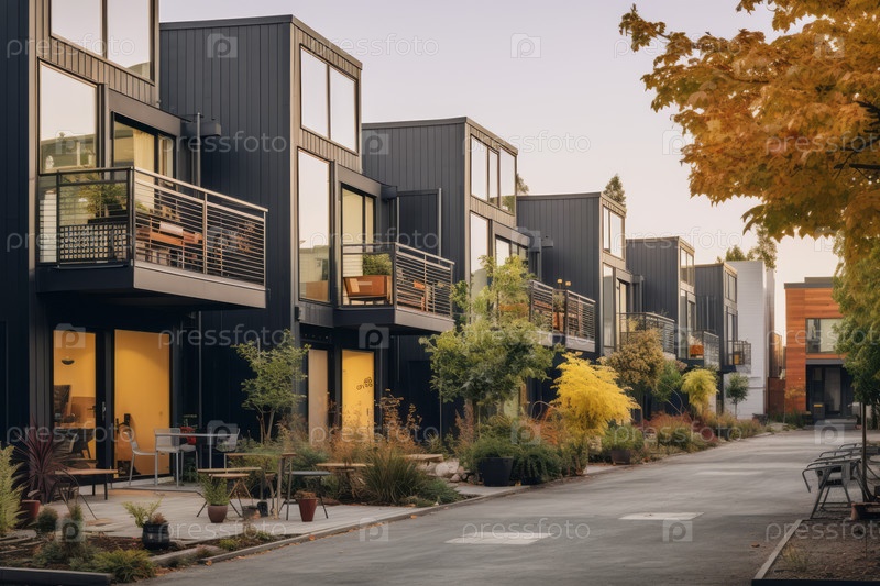 Внешний вид на ряд модульных таунхаусов с озелененными дворами и общими пространствами