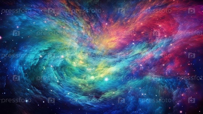 Завораживающая абстрактная иллюстрация космического фона с вращающимися галактиками, туманностями и звездами в блестящих ярких цветах