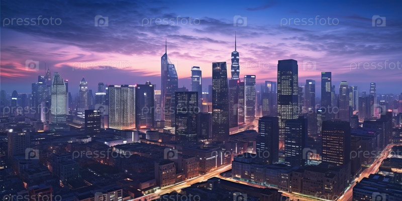 Панорамный вид на городской пейзаж при закате, с возвышающимися небоскребами, освещенными мягким светом городских огней