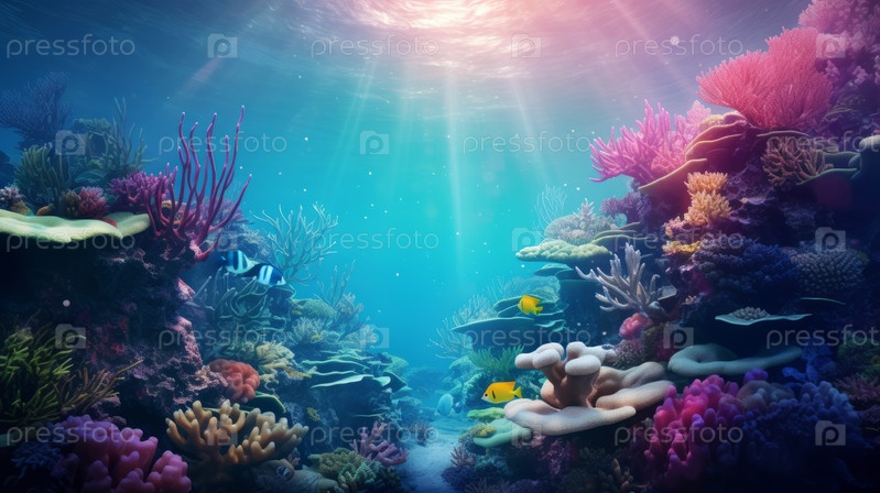 Вид на подводный мир с кораллами, яркими цветами и сложными структурами, кишащими морской жизнью