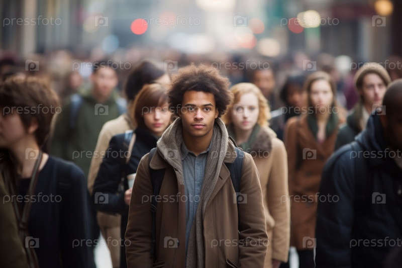 Портрет молодого афроамериканца в толпе людей, идущих по городской улице