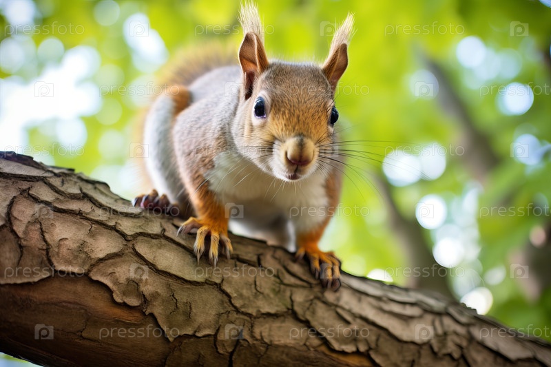 Закройте любопытную белку, сидящую на ветке дерева
