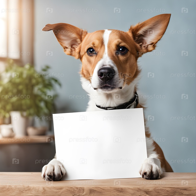 Портрет симпатичной собаки, держащей белую бумагу