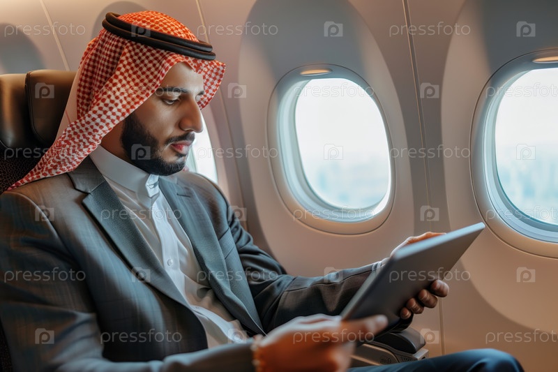 Арабский бизнесмен использует планшет в самолете во время деловой поездки