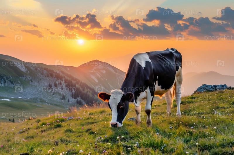 Красивая черно-белая корова пасется в живописном горном пейзаже на закате