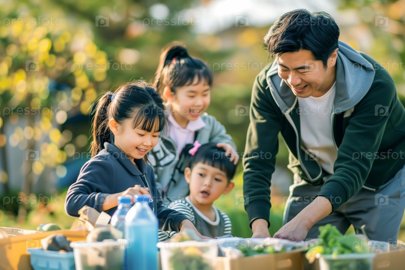 Веселая семья наслаждается днем волонтерской работы на открытом воздухе в парке. подчеркивая дух общинной приверженности и участия. низкая глубина поля зрения