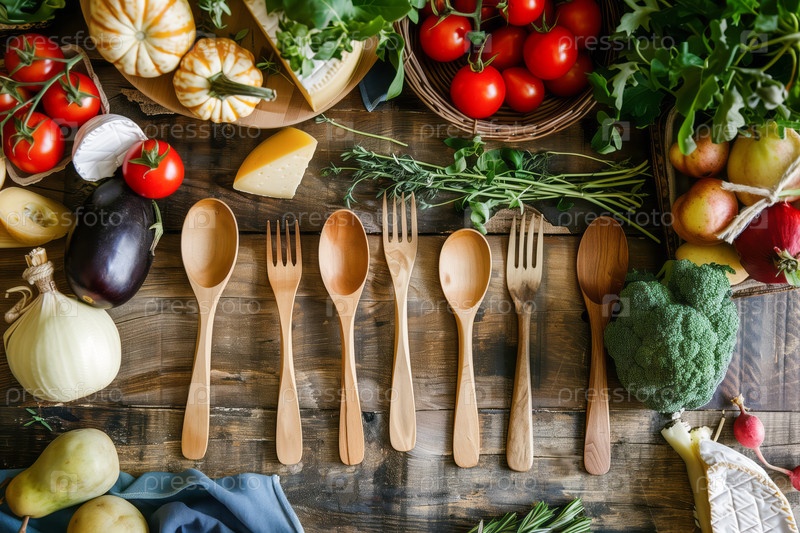 Уютная кухня фермерского дома с деревянной посудой, свежими овощами, травами и сыром на рустическом деревянном столе. Яркое и красочное изображение отражает сущность домашней кухни