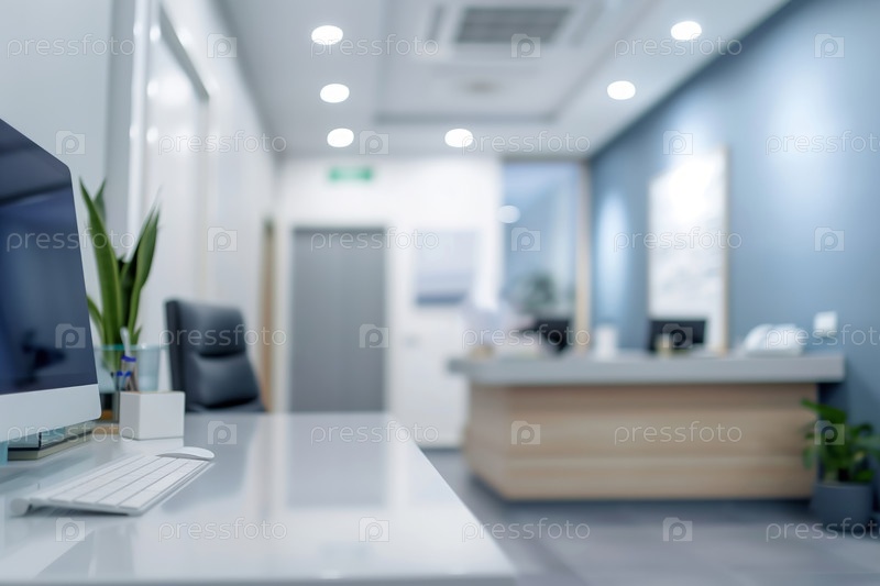 Размытый вид на современный интерьер медицинской клиники с приемной, канцелярскими принадлежностями, растениями и компьютером