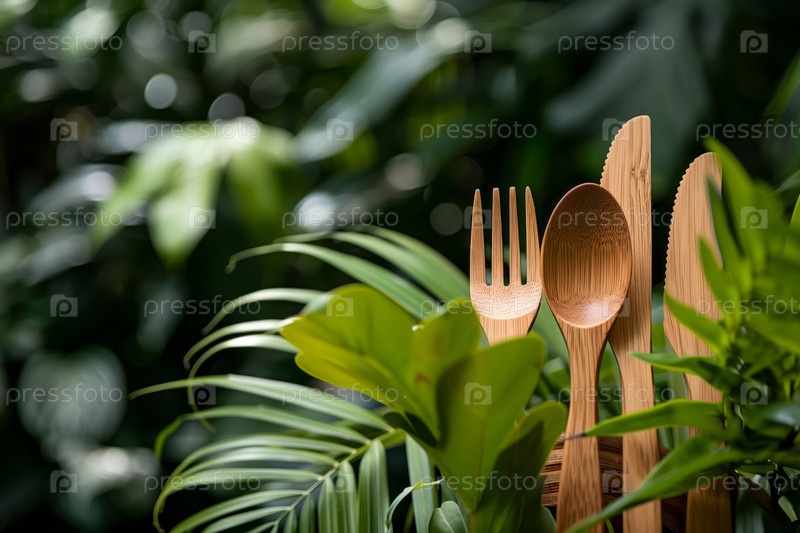 Близкий план экологически чистой деревянной столовой посуды, установленной среди пышного зеленого листья. Продвигать устойчивый образ жизни и стиль жизни, дружественный к природе. Копировать пространство. Низкая глубина поля