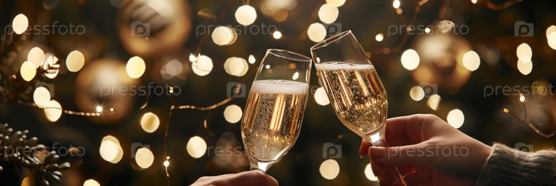 Два человека мигают стаканами шампанского на темном фоне с золотыми праздничными огнями по бокам