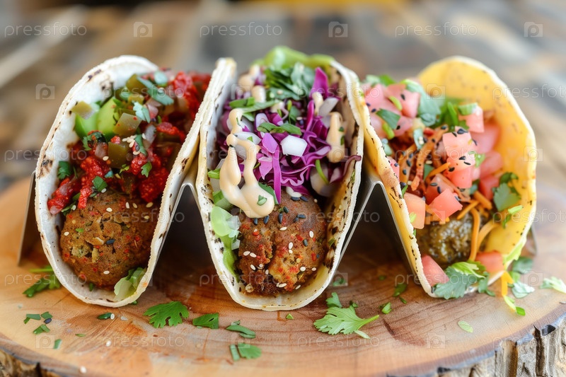 Яркие мексиканские тако, заполненные свежими ингредиентами на деревянном столе