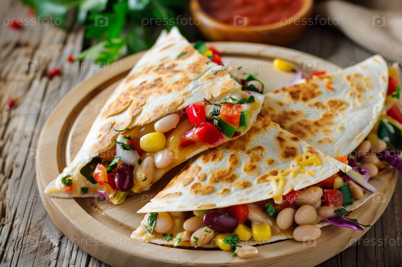 Закрытие квесадиллы, заполненной свежими овощами и подаваемой на деревянную доску