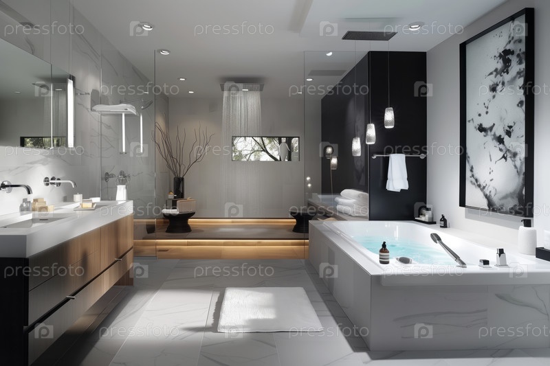 Простая ванная комната с ванной, дождевиком, мраморными плитками.Минимальный декор включает растения и большие произведения искусства