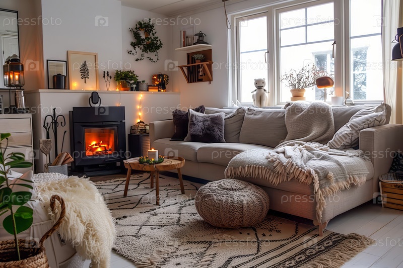 Уютная гостиная с камином, диваном и ковром. комната украшена растениями, свечами и одеялами