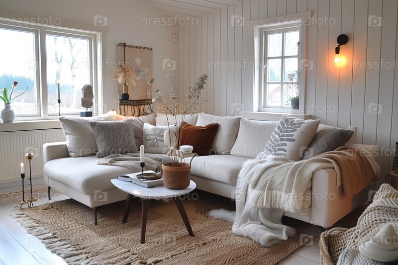 Уютная гостиная с белым диваном и кофейным столом. комната украшена растениями, ковром и одеялами