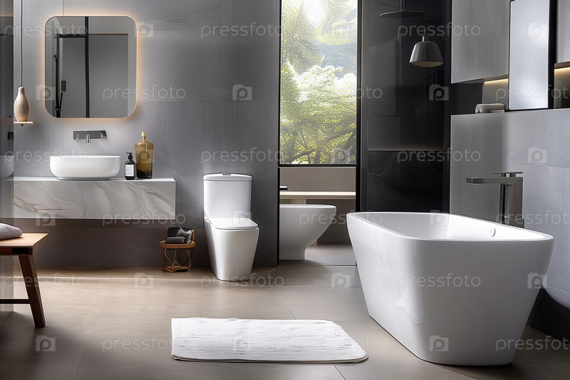 Минималистическая ванная комната со свободно стоящей ванной, туалетом и раковиной. Большое окно с видом на пышный зеленый ландшафт. Чистый, современный дизайн с серыми плитками и белым ковром