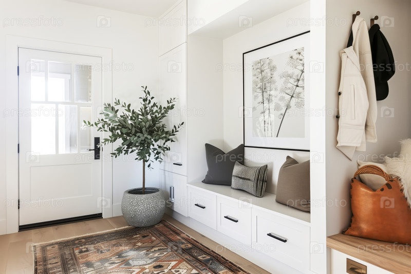 Современный вход с скамейкой, хранилищем, растениями, ковром и произведениями искусства на белых стенах, создавая радушную минималистическую атмосферу