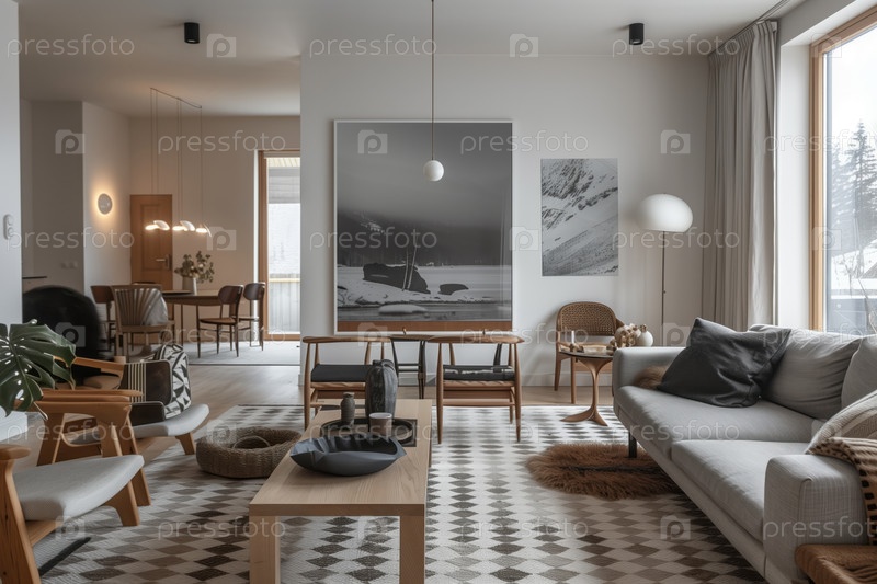 Современная скандинавская гостиная с диваном, ковром, деревянным столом для кофе, большим окном, картиной на стене и деревянными стульями