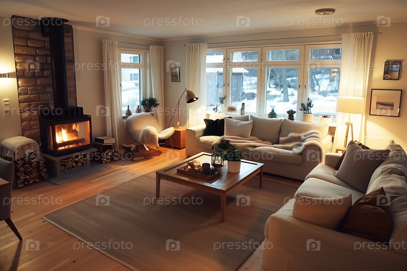 Уютная гостиная имеет камин с ревущим огнем, удобные диваны и большое окно с видом на заснеженный пейзаж