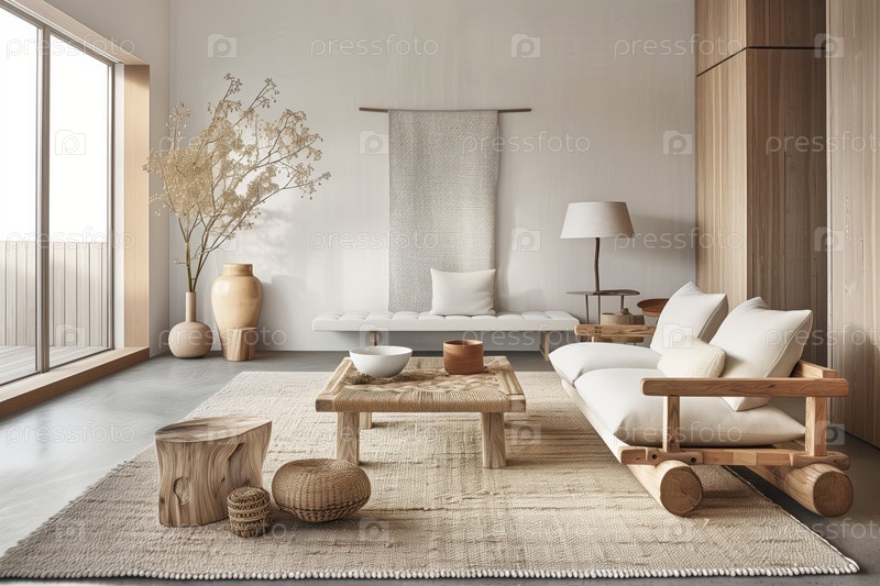 Минималистическая скандинавская гостиная с деревянным диваном с белыми подушками, кофейный стол, ковер и большим окном
