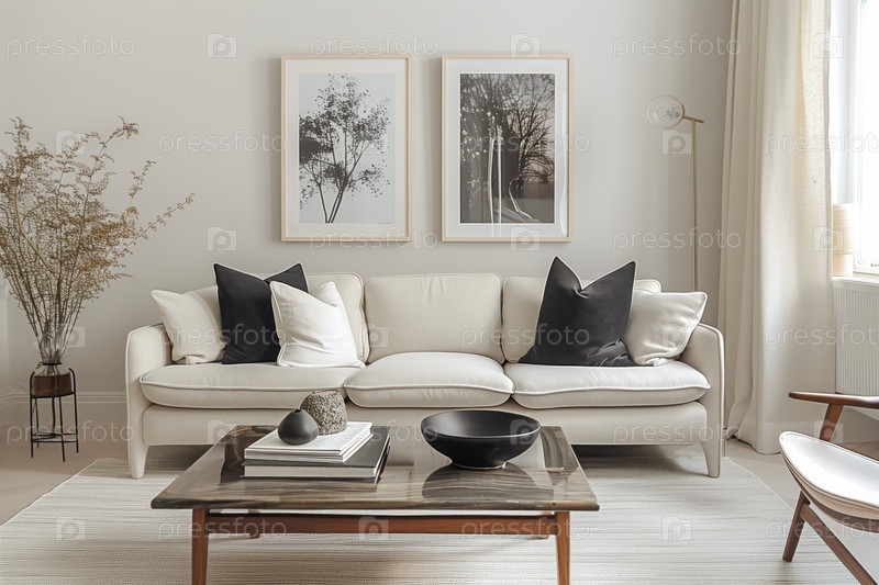 Современная скандинавская шикарная гостиная с белым диваном, кофейным столом, картинками на стене